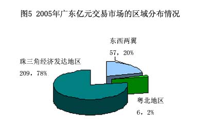 广东省批发业总体上向规模化、专业化的趋势发展,交易市场十分活跃。但与零售业相比,批发业的经营形态创新度不够,传统的对手买卖贸易行为较多。从统计数据可知,广东全省2005年末拥有亿元商品交易市场282家,实现成交额1948.95亿元,比上年增长22.6%。从地域分布来看,主要聚集在珠三角经济发达地区,深圳、广州、佛山等地有219个,约占78%;而东西两翼共57个,约占20%;粤北等山区城市仅6个,约占2%。批发市场的区域分布不平衡,见图5。