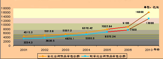 “十五”期间,广东省社会消费品零售总额增长迅速,平均增长率为14.9%;批发零售业商品销售总额的平均增长速度为19.4%,增速十分可观。预计“十一五”期间广东省社会消费品零售总额将保持15%的增长速度,至2006年这一指标将达到9100亿元,至2010年将达到1.6万亿元,详见图2所示。