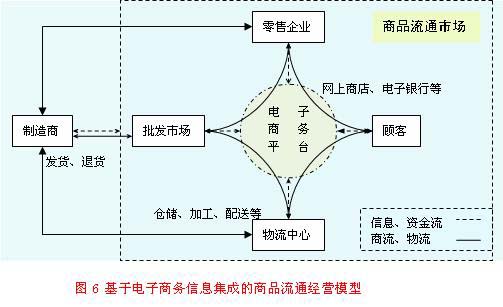 广东商贸流通企业实现信息化后,将进入以信息流全程优化物流、资金流,高效整合现有电子商务资源和进行内外部业务流程再造的新阶段,以改善流通节奏慢,商品周转率低,流通成本高,市场信息不对称,运转效率低等制约流通业发展的问题。逐步形成基于电子商务的信息集成的商品流通经营模式,使流通业进一步发挥促进产业链的提升与壮大。见图6。
