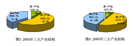广东省流通业已进入一个重要转型期,产业结构进一步优化调整,流通业的快速增长改变着整个经济的比例结构,2005年,全省第三产业实现增加值亿元9579.44亿元,比2004年增长10.8%,增加值的增长速度为13.7%,居全国各省市第六。从三次产业结构看,第三产业发展与迅速发展的制造业相比明显滞后,从1990年到2005年,第三产业占GDP的比重从36.8%上升为44.1%。从图3和图4的反应三大产业结构变动情况,2005年全省三大产业结构为6.33:49.52:44.14,其中,第一产业下降了1.5个百分点,第二产业增幅比上年下降了近6个百分点,而第三产业则比上年大幅度地增加了7.3个百分点。