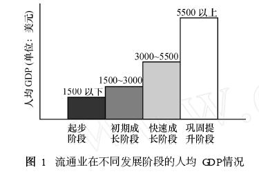 流通业作为先导性产业的成长过程可分为四个阶段:起步阶段、初期成长阶段、加速成长阶段、巩固提升阶段。流通业发展不同阶段的人均GDP情况用图显示如下: