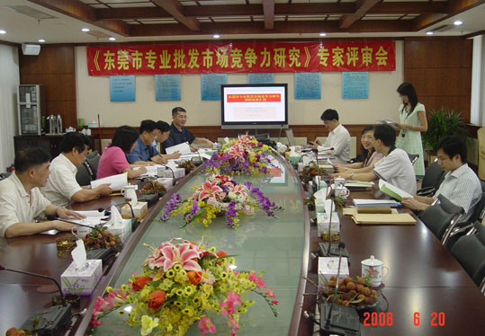 2008年6月19日上午,《东莞市专业批发市场竞争力研究报告》专家评审会在东莞市经济贸易局十七楼会议室举行。参加会议的专家组成员有广东商学院原副院长、广东省商业经济学会会长徐印州教授;广东工业大学经济管理学院副院长张德鹏教授、广州市商道咨询有限公司总经理李志坚、东莞理工大学莫安达教授、东莞市信立农副产品贸易城总经理蒋秀梅、东莞市富民集团有限公司副总经理苏松胜、东莞联冠集团副总裁陈正祥。参加会议的课题组成员有东莞市经济贸易局叶葆华副局长、东莞市经贸局贸易流通科刘锦棠科长、广东商学院流通经济研究所王先庆教授等。