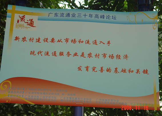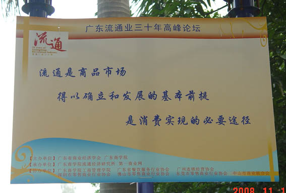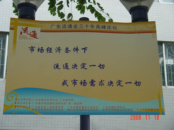 2008年11月18日,“广东流通业三十年回顾与展望高峰论坛”在广东商学院隆重举行。本次会议由广东省商业经济学会、广东商学院主办,广东商学院流通经济研究所和第一商业网承办,广东商学院工商管理学院等单位协办。来自广东省内各大百货、购物中心、超市及连锁品牌的公司总裁和商家代表及省内高校500余人出席了此次的盛会。共同见证了2008年广东商贸流通行业规模最大、规格最高的盛会,一起回首过往三十年广东流通业走过的艰辛历程,总结广东流通业三十年发展得失成败。