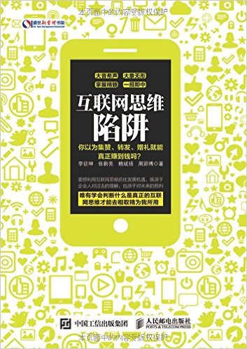 《互联网思维陷阱:你以为集赞、转发、赠礼就能真正赚到钱吗?》从三个部分详细讲解,第一部分【迷局】开门见山揭示让企业“雾里看花”的三大互联网思维陷阱;第二部分【破局】通过三个问题,帮助企业在“热现象”下进行“冷思考”,获得“互联网思维不能取代一切”的启示;第三部分【立局】通过使命感、参与感、专注力、开放性四个关键点,摆脱思考惯性,成为有互联网思维的企业;第四部分【变革】通过帮助企业找到自己的获利点,做一家什么样的公司、产品,能够真正能赚到钱。
