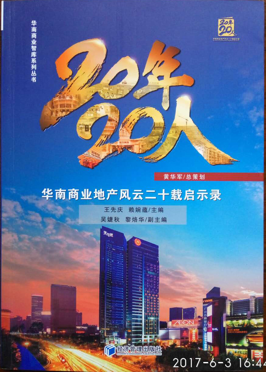 《20年20人 华南商业地产风云二十载启示录》是华南商业智库系列丛书之一。该书2017年5月由经济管理出版社出版,该书由第一商业网总裁黄华军任总策划,华南商业智库理事长、m88在线网站入口流通经济研究所所长、广东省商业经济学会会长王先庆、第一商业网总编辑赖婉蕴担任主编,第一商业网记者吴婕秋、黎烙华担任副主编,全书逾15万字,为广大商业地产及相关行业从业人员提供了一个生动而鲜活的视角。