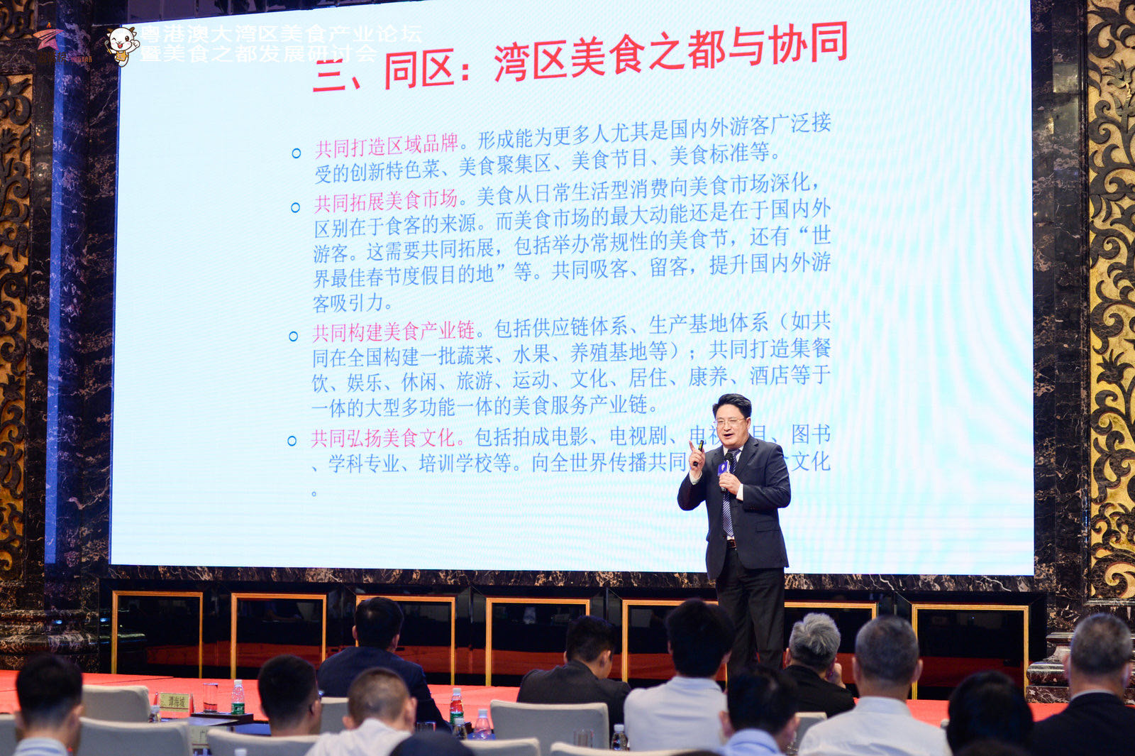在主题演讲环节,王先庆会长发表题为《美食推动粤港澳大湾区经济协同发展》的讲话,他讲到:岭南文化特性与美食是具有同根性、美食产业布局与链接的同链性、湾区美食之都与协同的同区性。首先,湾区风格的菜系和就餐方式、服务体系、就餐风格等注定岭南美食的同根、同源、同文。同宗。其次,大湾区各城市美食的产业链、资本链、服务链又交错融合,形成如同链条一般的紧密联系。到如今,人民日益增长的美好生活需要让湾区美食产业协同起来,共同打造区域品牌、拓展美食市场、构建美食产业链、弘扬美食文化。主题演讲环节,还有谭海城会长分享了《粤港澳大湾区餐饮产业报告》。宋杨先生带来《大数据导航餐饮进化新方向》。