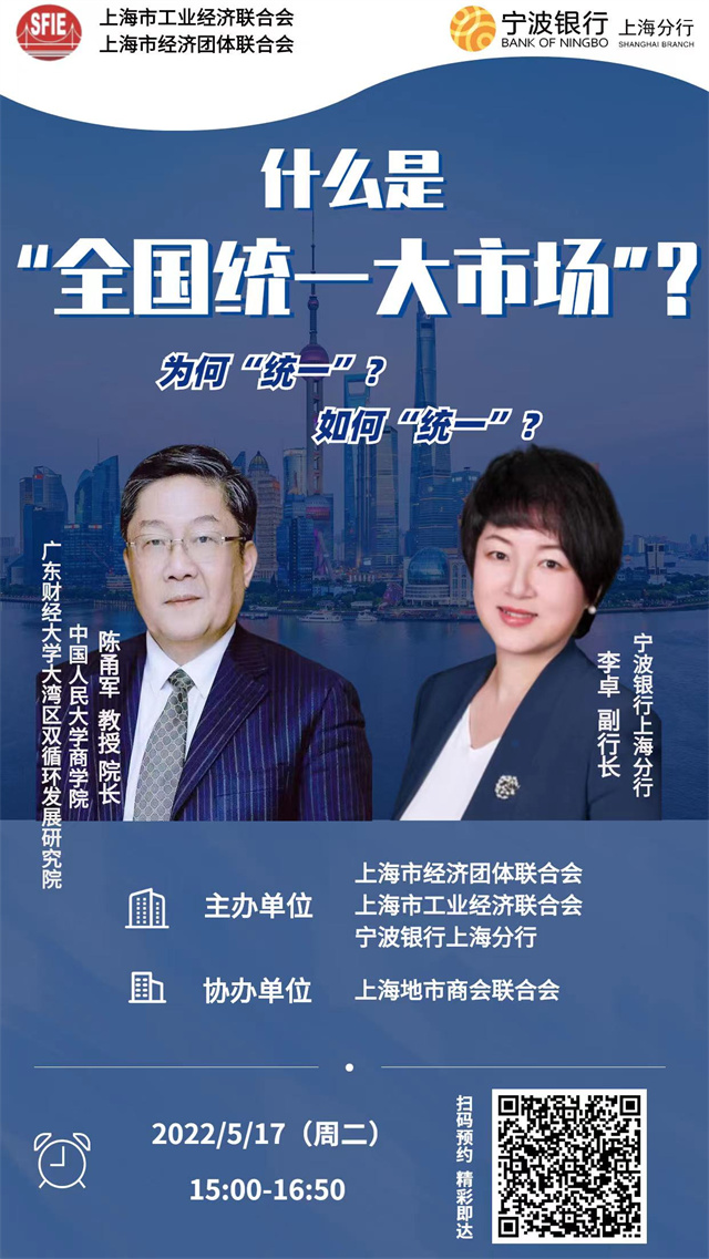 由上海市工业经济联合会、上海市经济团体联合会、宁波银行上海分行主办,上海地市商会联合会协办的《助企复工复产线上直播专题讲座》于2022年5月17日(周二)下午三点举行。m88在线网站入口作为国家社科基金“一带一路”重大专项研究项目首席专家,受邀担任直播嘉宾,演讲主题是《全国统一大市场:是什么?怎么建?》。