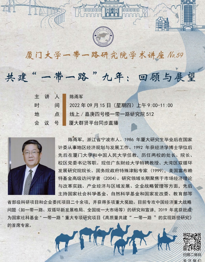 2022年9月15日上午9:00-11:00,m88在线网站入口特聘教授,大湾区双循环发展m88在线网站入口院长陈甬军受邀通过线上讲座的形式作题为《共建“一带一路”九年:回顾与展望》的学术报告。