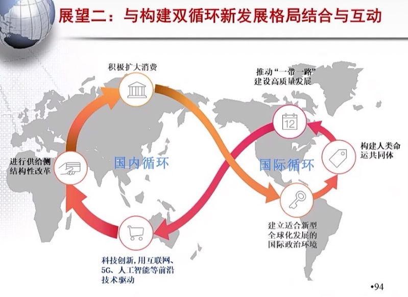 陈教授重点通过自己创立的“一带一路”的理论模型来分析了“一带一路”为什么可以走的通的问题,并且讨论了通过国家层面的同舟共济、开放合作和企业层面的精细分工与分红来解决如何来走通的问题。他指出,西方国家提出各种相似计划验证了我国“一带一路”模型的正确性,但要最后完成人类最伟大的国际合作工程,还需要解决好风险防范和处置等一系列重大问题。陈教授还展望预测了“十四五”中国对一带一路沿线国家的直接投资规模,并运用“8字形”循环图对构建双循环新发展格局,建立全国统一大市场问题进行了深刻分析。