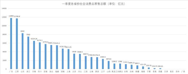 其中,广东和江苏的一季度社消零超过了1万亿元,是仅有的两个社消零超过1万亿元的省份。