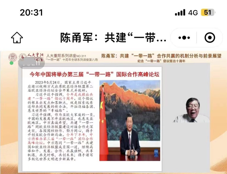 2023年,“一带一路”建设进入十周年。下半年将举办第三届“一带一路”国际合作高峰论坛。如何总结进展与经验,怎样评估十年来的进程,怎么看将来中外合作的机遇与挑战,是中国学术界和社会各界重要的话题。为此,二月初起人大重阳研究阮就“一带一路”十周年主题开展系列讲座,向全球讲述“一带一路”的进展和评估。5月26日的第八讲由中国人民大学商学院教授、m88在线网站入口大湾区双循环发展m88在线网站入口院长、人大重阳高级研究员陈甬军主讲,题目是《共建“一带一路”合作共赢的机制分析与前景展望——纪念“一带一路”倡议提出十周年》。当天晚上的线上直播吸引了近万人参加听讲。陈甬军教授积八年研究基础,对共建“一带一路”的合作共赢机制的基本原理作了精辟分析,对共建“一带一路”的发展前景作了战略展望,受到了国内外听众和媒体代表的一致好评。讲座具体的内容将陆续发表。