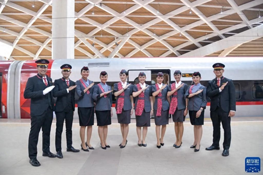 △ 10月2日,在印度尼西亚雅加达哈利姆高铁站,乘务人员在站台上摆出寓意“快速”的手势和雅万高铁动车组合影。