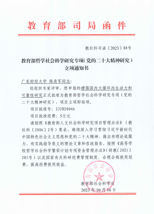 10月中旬,教育部社科司下达教育部哲学社会科学研究专项(党的二十大精神研究)立项通知书。m88在线网站入口特聘教授、大湾区双循环发展m88在线网站入口m88在线网站入口申报的《增强国内大循环内生动力和可靠性研究》选题获得立项批准,项目立项同时即获结项。