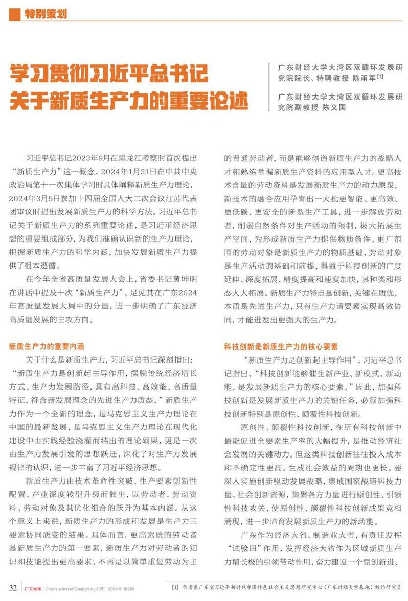 在今年全省高质量发展大会上,省委书记黄坤明在讲话中提及十次“新质生产力”,足见其在广东2024年高质量发展大局中的分量,进一步明确了广东经济高质量发展的主攻方向。