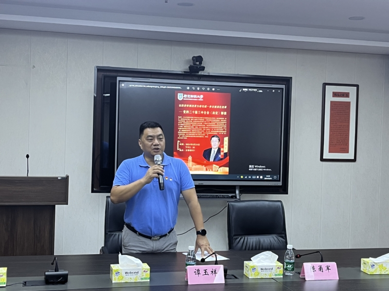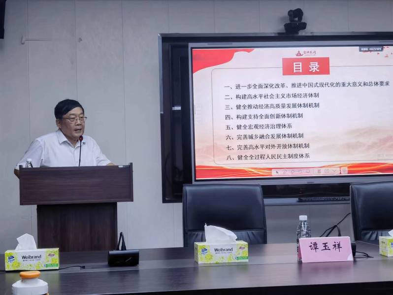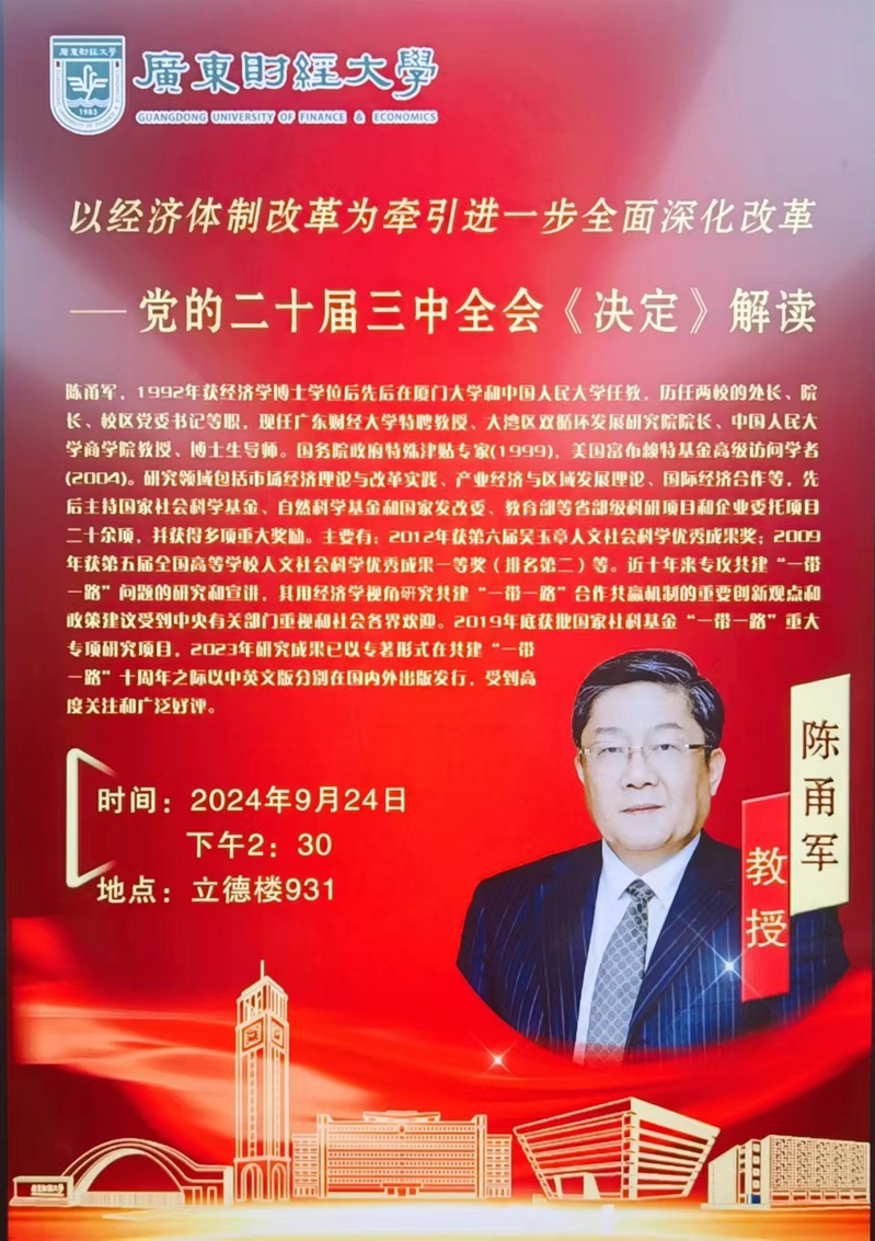 9月24日下午,大湾区双循环发展m88在线网站入口院长陈甬军教授应外国语学院党委之邀,为外国语学院全体党员作了《以经济体制改革引领全面深化改革~党的二十届三中全会<决定>解读》的党课讲座。讲课以对《决定》高屋建瓴的逻辑体系解读为开端,详细介绍了《决定》前七章的内容,特别强调了创新人才培养对于建设高水平财经大学和外语学科的重要意义,获得了全体听讲的教师和学生党员的一致好评。