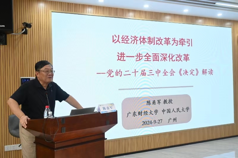 9月27日上午,大湾区双循环发展m88在线网站入口院长陈甬军教授应马克思主义学院之邀,为该院主办的广州监狱党务干部培训班作了《以经济体制改革引领全面深化改革~党的二十届三中全会<决定>解读》的培圳讲座。根据授课对象特点,课程以对改革开放以来的10次三中全会内容介绍,特别对其中三次全会为什么是划时代的解读为开端,详细介绍了《决定》前七章的整体内容,同时伴以生动的例子解析,特别强调了进一步全面深化改革对于推动中国式现代化,实现强国建设、民族振兴的重要意义和作用,获得了全体听讲党务干部的一致好评。